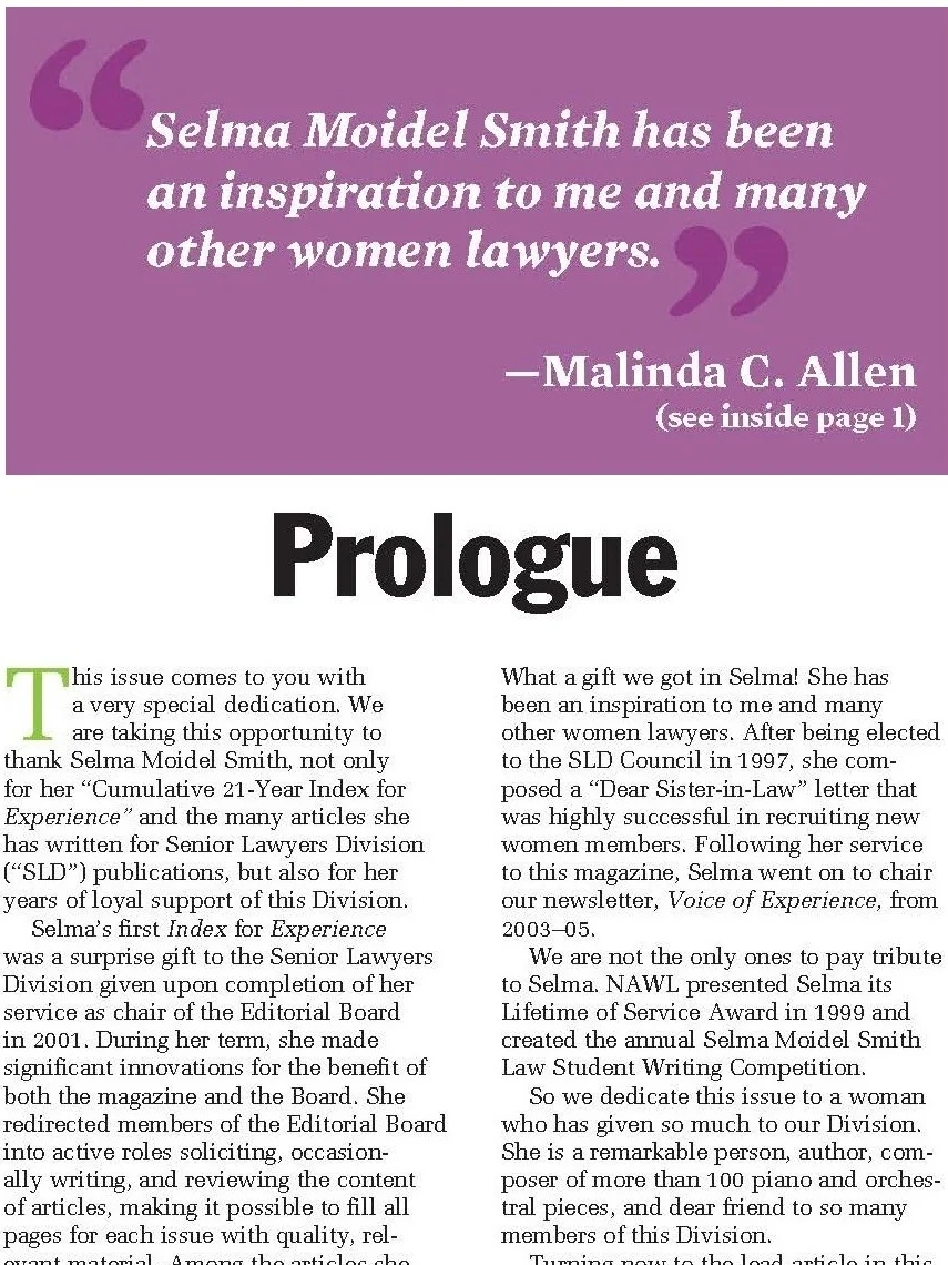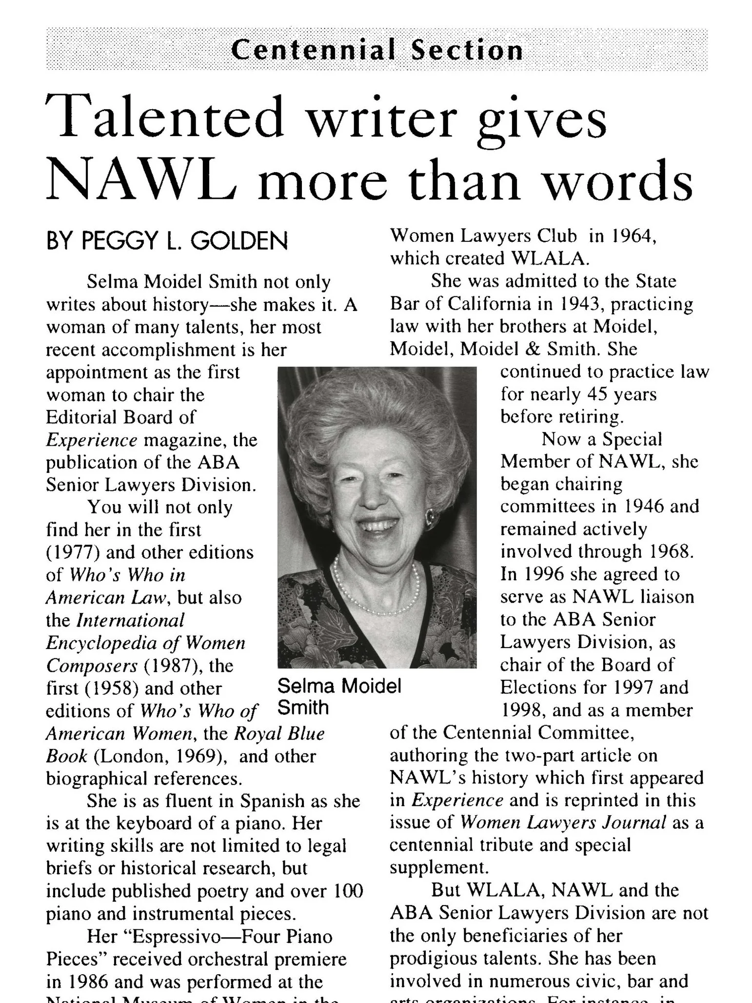 Biographical Feature introducing Selma’s “Centennial History of NAWL”