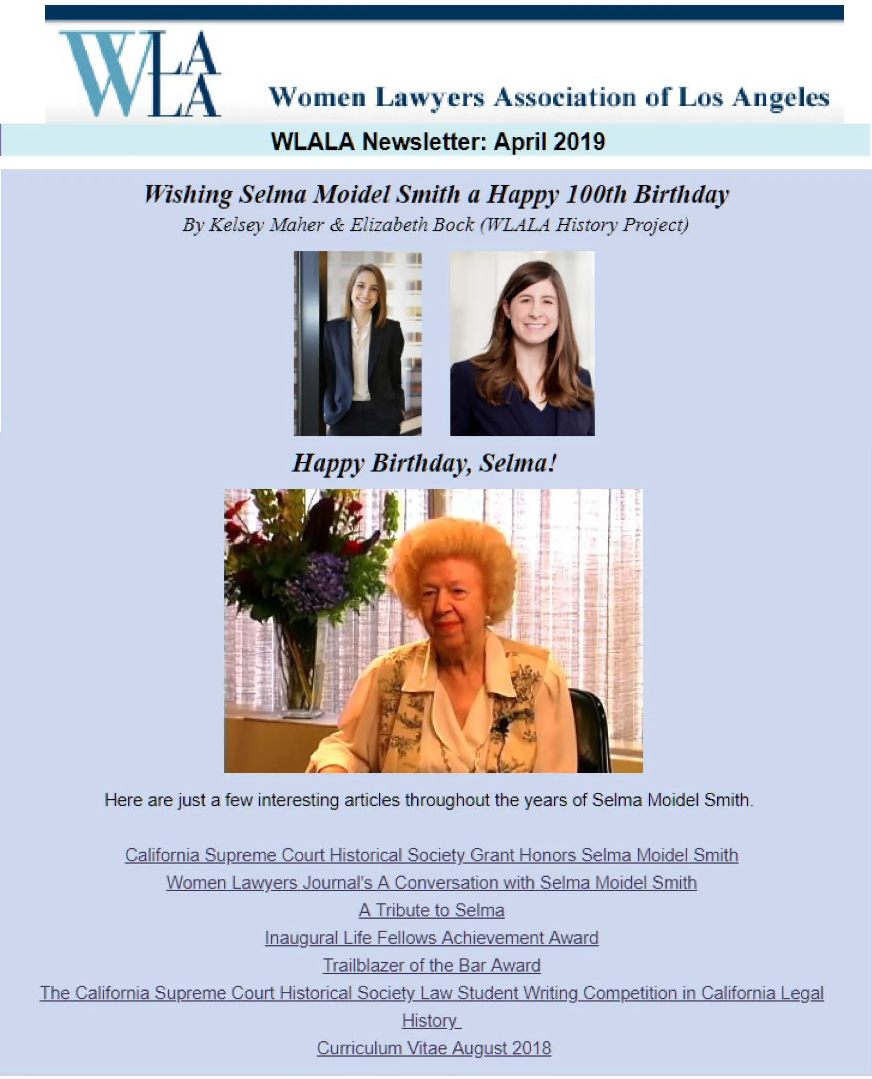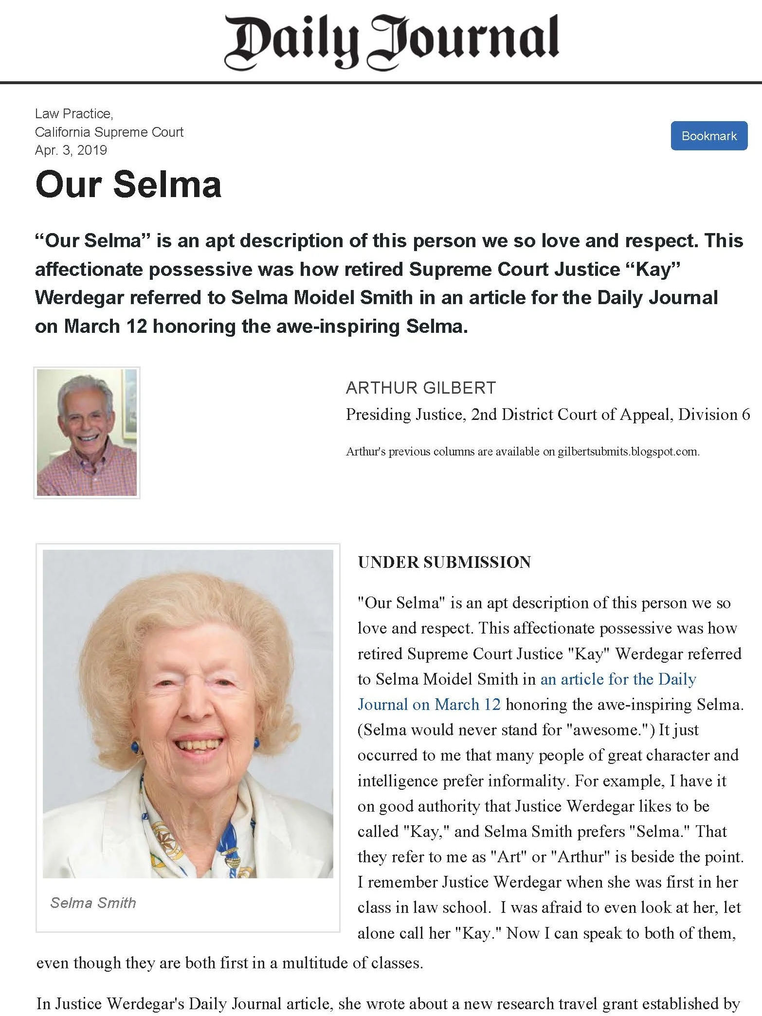 “California Supreme Court Historical Society grant honors Selma Moidel Smith,” Daily Journal (Los Angeles and San Francisco), March 12, 2019.
