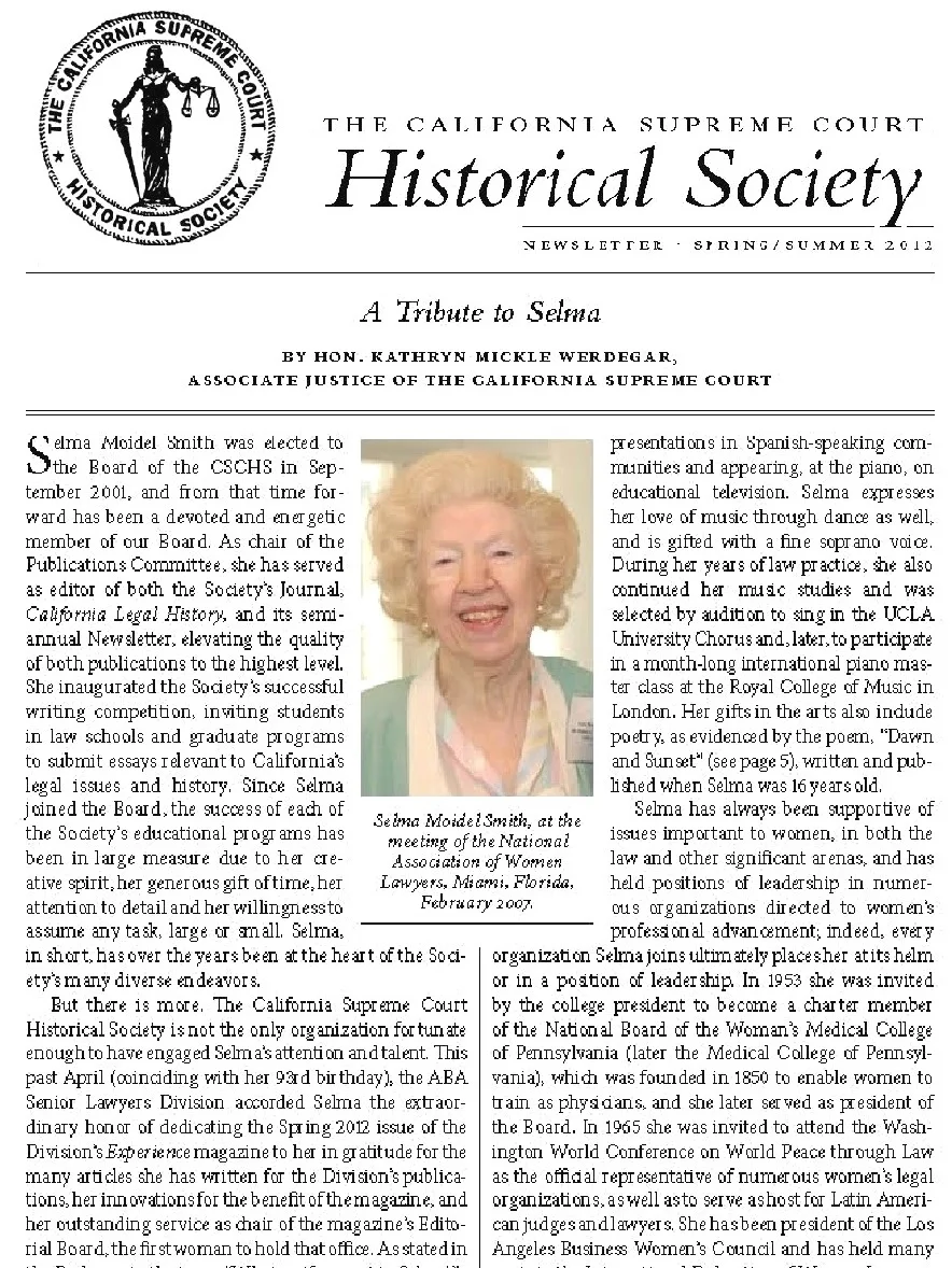“Celebrating Selma — Pillar of the California Supreme Court Historical Society,” CSCHS Newsletter (Spring/Summer 2019): 19-20.